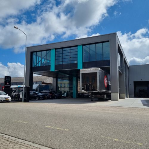 Toegepaste materialen: Stalen dakplaten 125R1000 - Sandwich 100Wb1060 - Wandpanelen in kleur Ral 9007 Orion - Aluminium composiet