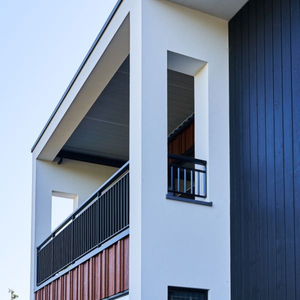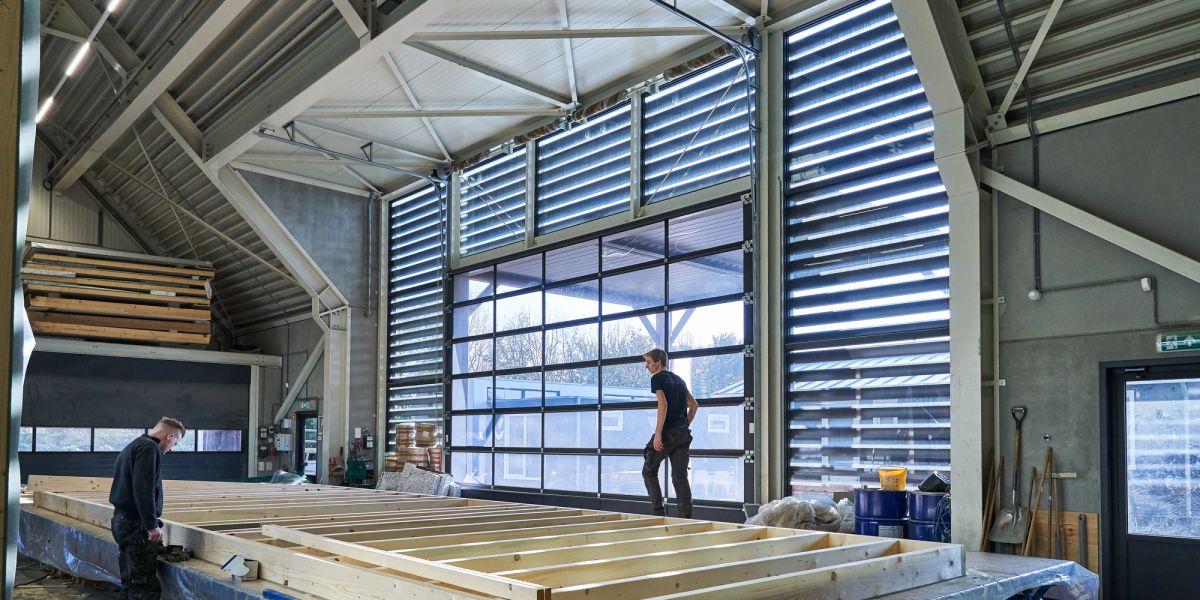 Toegepaste materialen: Op het dak plaatsten we stalen dakplaat 158R930 Perfo (kleur: Ral 9002) in combinatie met sandwich FALK TR11003+ 60/90 dakpanelen (Ral 7016 Matt). Op de gevels plaatsten we SAB vlakke 60mm wandpanelen in combinatie met houtwerk gevelbekleding, boeidelen en overstekken, afgewerkt met zetwerk (HPS Hamlett).